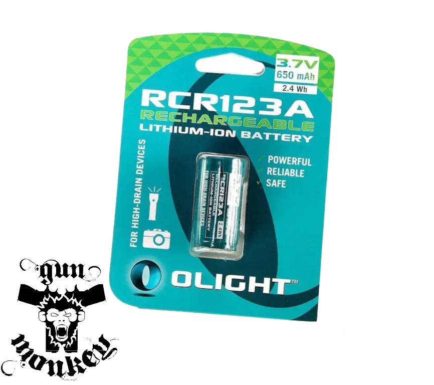 Akumulator Olight litowo-jonowy RCR123 (16340). Doskonałe, oszczędne rozwiązanie dla osób intensywnie użytkujących wyposażenie w postaci oświetlenia taktycznego lub laserowych wskaźników celu. Stanowi zasilanie większości latarek i laserów przeznaczonych do broni, jak również latarek ręcznych oferujących duże natężenie światła. Może być przydatny również z niektórymi modelami celowników optoelektronicznych np. marki EOTech. Pozwala zaoszczędzić na kupnie drogich ogniw CR123A.